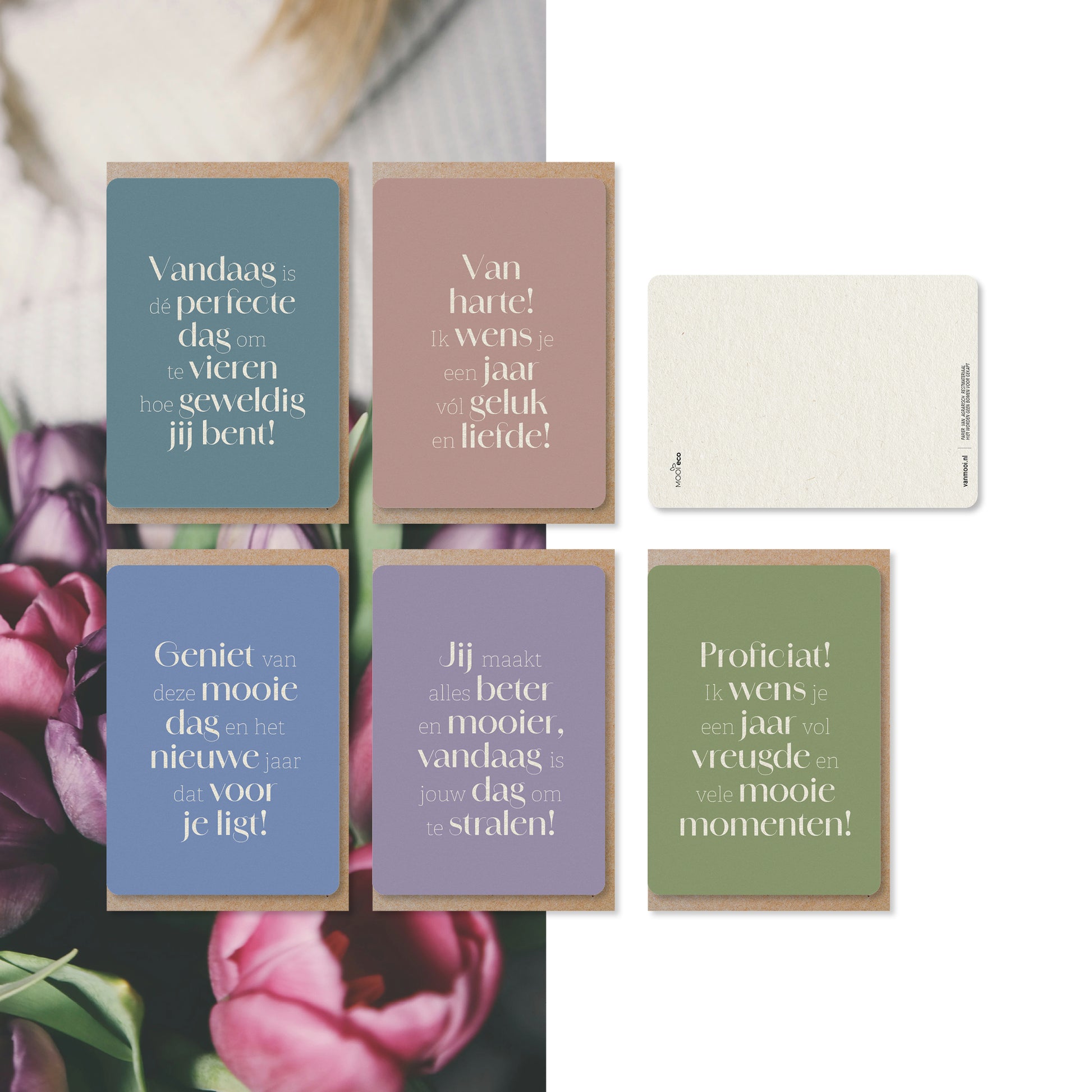 De set bestaan uit 5 duurzame enkele kaarten met verschillende teksten voor een felicitatie: