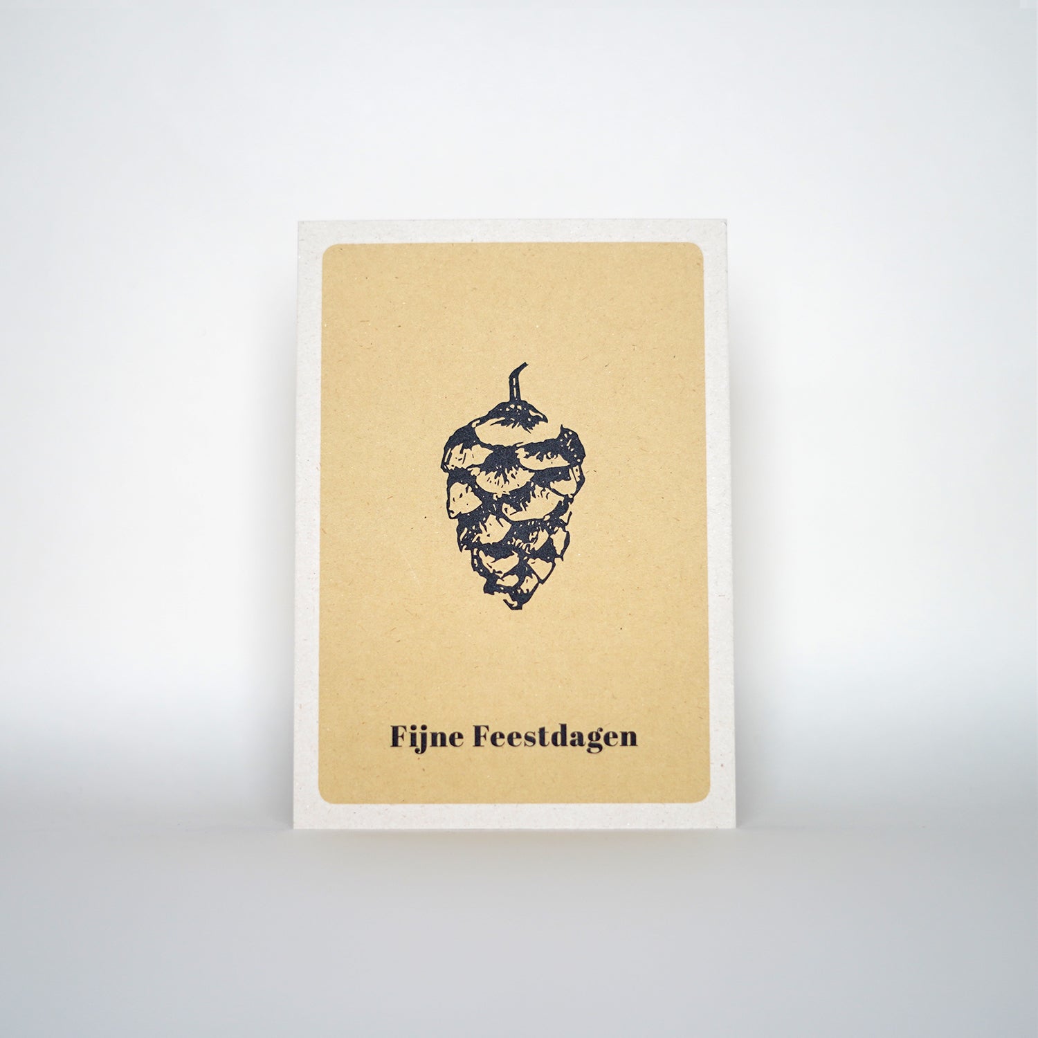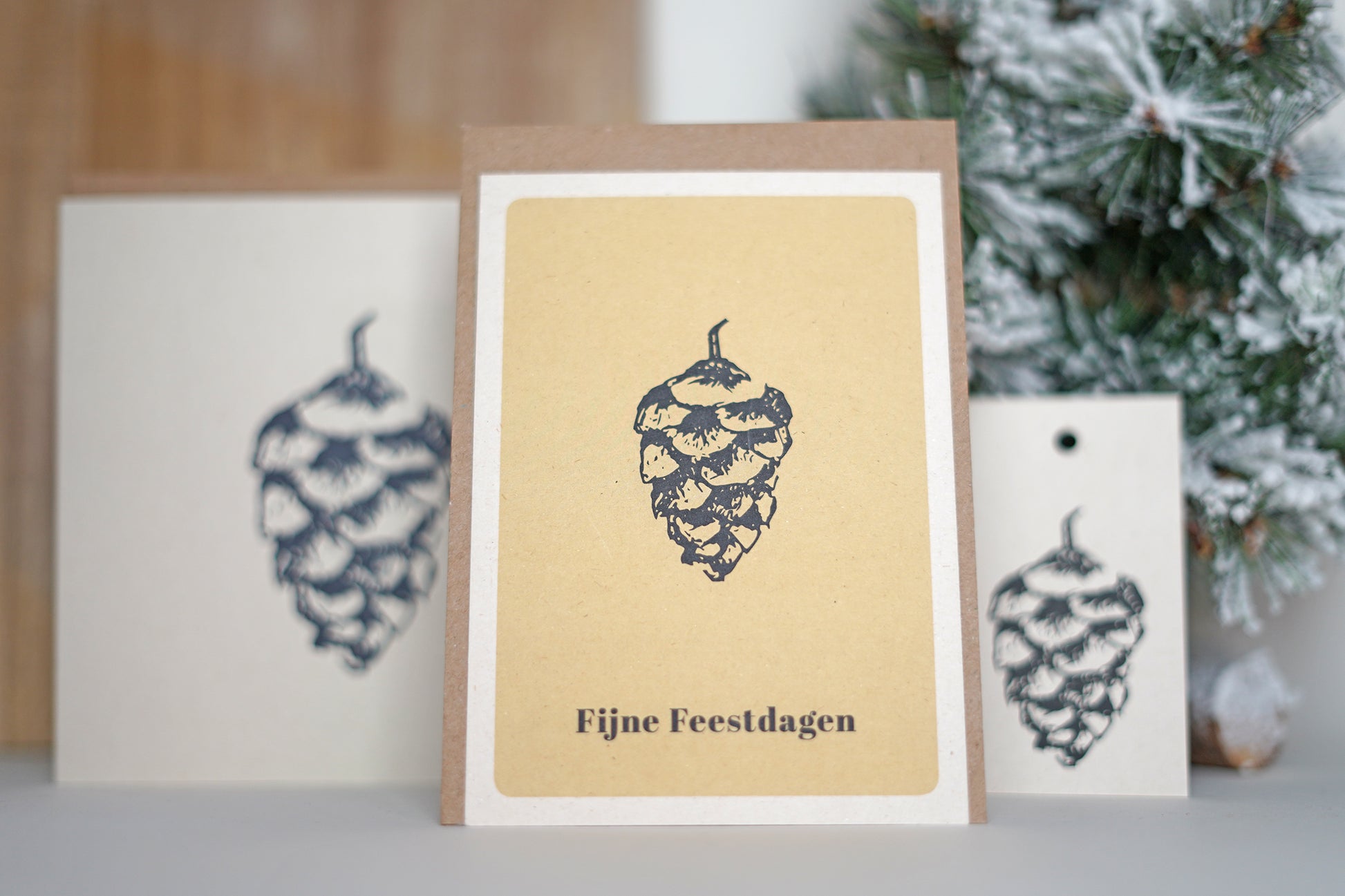Een mooie duurzame enkele kaart met een handgetekende dennenappel voor een Kerstgroet of een Nieuwjaarswens. De illustraties zijn gemaakt in onze grafische studio. Gedrukt op Paperwise Naturel, boomvrij papier van landbouwrestafval.