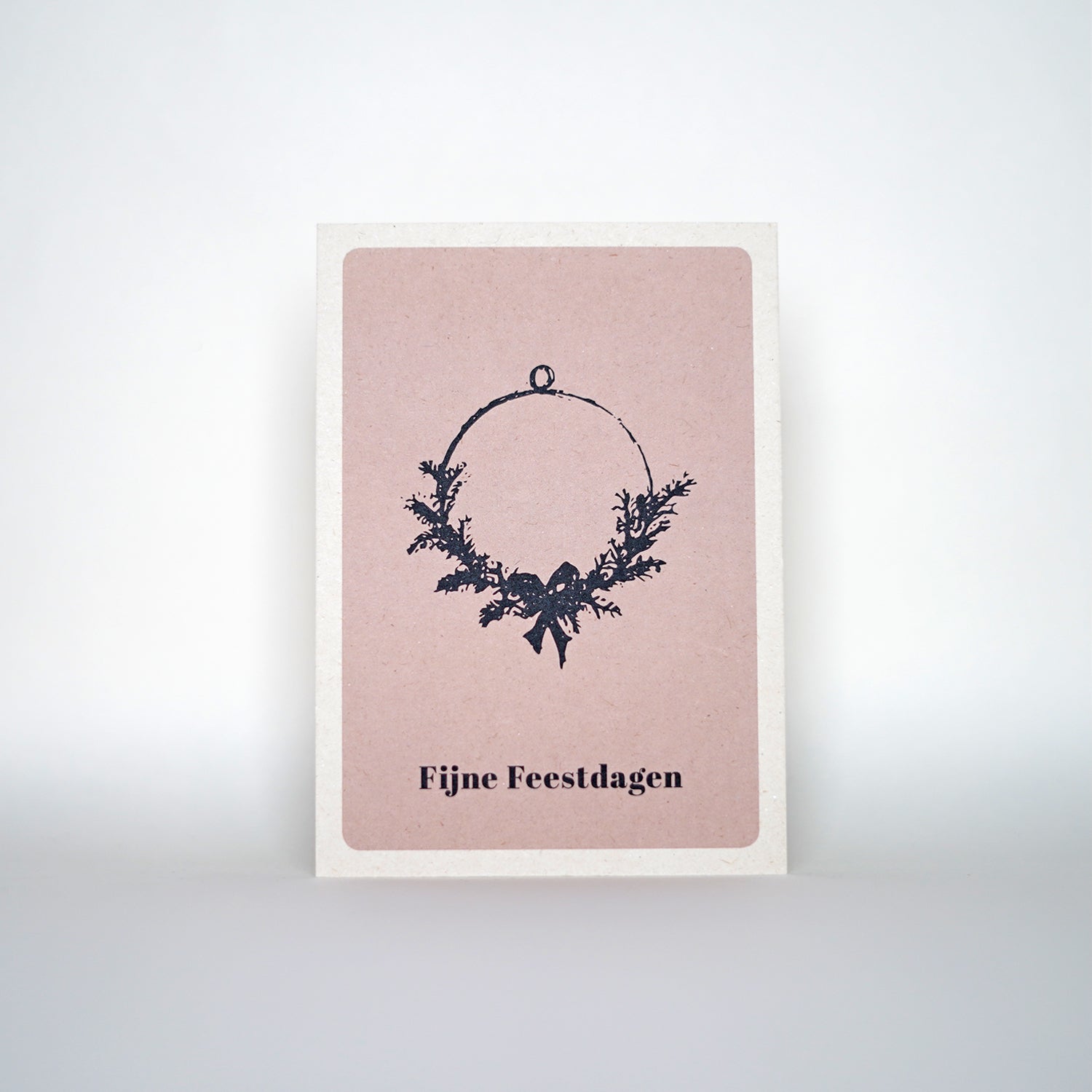 Een mooie duurzame enkele kaart met een handgetekende krans voor een Kerstgroet of een Nieuwjaarswens. De illustraties zijn gemaakt in onze grafische studio. Gedrukt op Paperwise Naturel, boomvrij papier van landbouwrestafval.